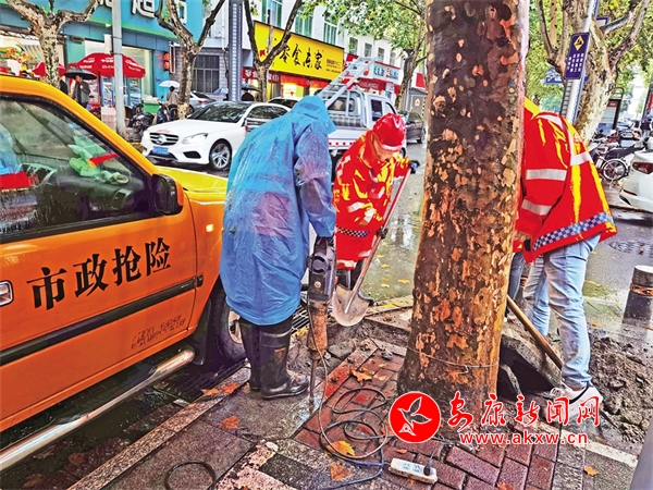 10月6日,市政園林公司工作人員冒著大雨在安康城區(qū)興安東路搶修電纜。陳德模 攝