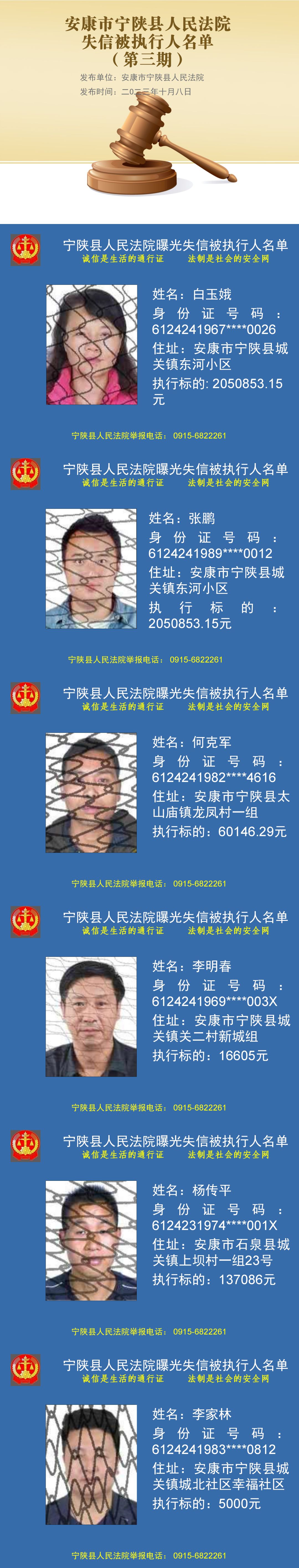 為維護(hù)司法權(quán)威,推動(dòng)社會(huì)誠(chéng)信體系建設(shè),促使被執(zhí)行人履行生效法律文書確定的義務(wù),根據(jù)《中華人民共和國(guó)民事訴訟法》第二百五十五條和《最高人民法院關(guān)于公布失信被執(zhí)行人名單信息的若干規(guī)定》的規(guī)定,被執(zhí)行人具有履行能力而不履行生效法律文書確定的義務(wù),人民法院應(yīng)當(dāng)將其納入失信被執(zhí)行人名單,依法對(duì)其進(jìn)行信用懲戒?,F(xiàn)將安康市寧陜縣人民法院2023年第三期失信被執(zhí)行人名單予以公布。