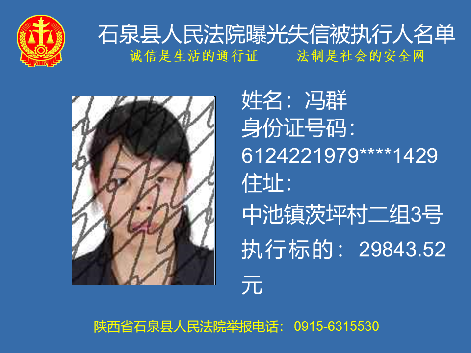 為了進一步加大執(zhí)行力度,保障勝訴當事人的合法權益,推進社會誠信體系建設,依照《中華人民共和國民事訴訟法》、《最高人民法院關于公布失信被執(zhí)行人名單信息的若干規(guī)定》等法律、司法解釋的有關規(guī)定,現對一批已進入執(zhí)行程序,且尚未全部履行義務的被執(zhí)行人進行媒體曝光,歡迎廣大群眾支持石泉縣人民法院的工作,向我院提供被執(zhí)行人的財產線索,使生效法律文書能夠得到切實執(zhí)行,讓人民群眾切實感受到公平正義就在身邊。
