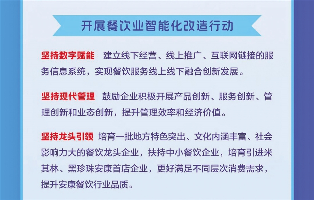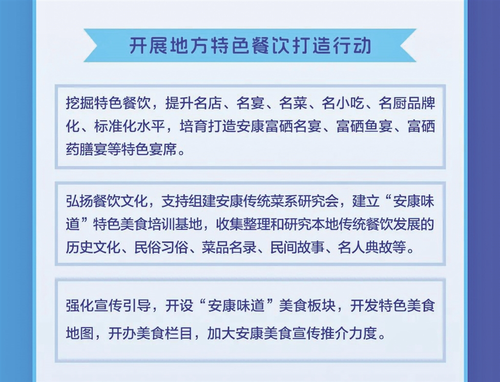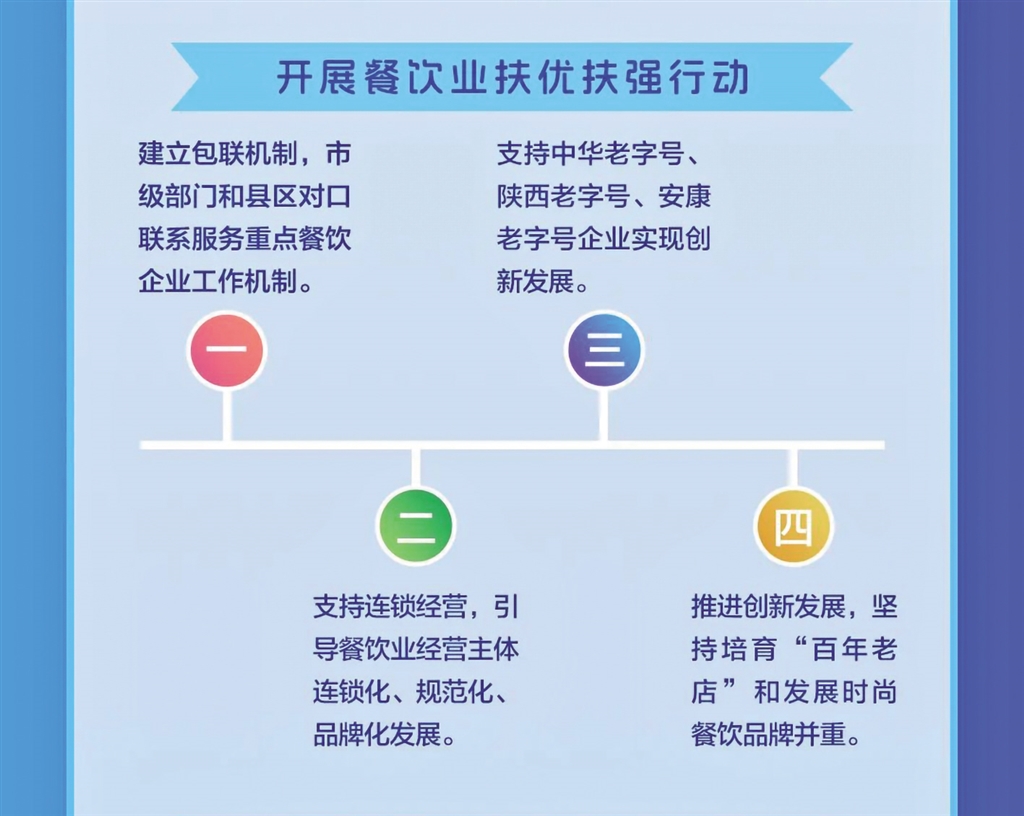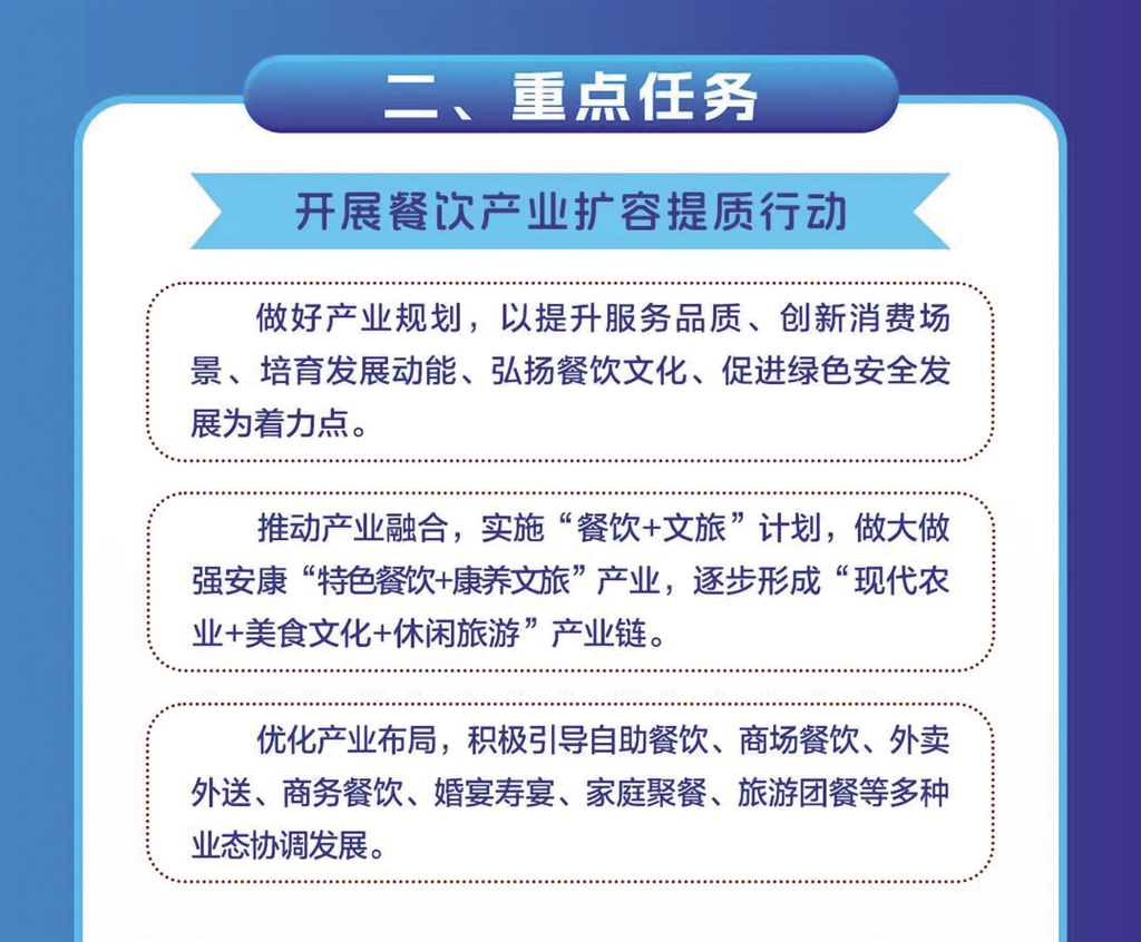 日前,安康市商務局等11部門聯合發(fā)布《關于進一步推進全市餐飲業(yè)高質量發(fā)展的實施意見》,本期帶您一圖讀懂其重點任務。