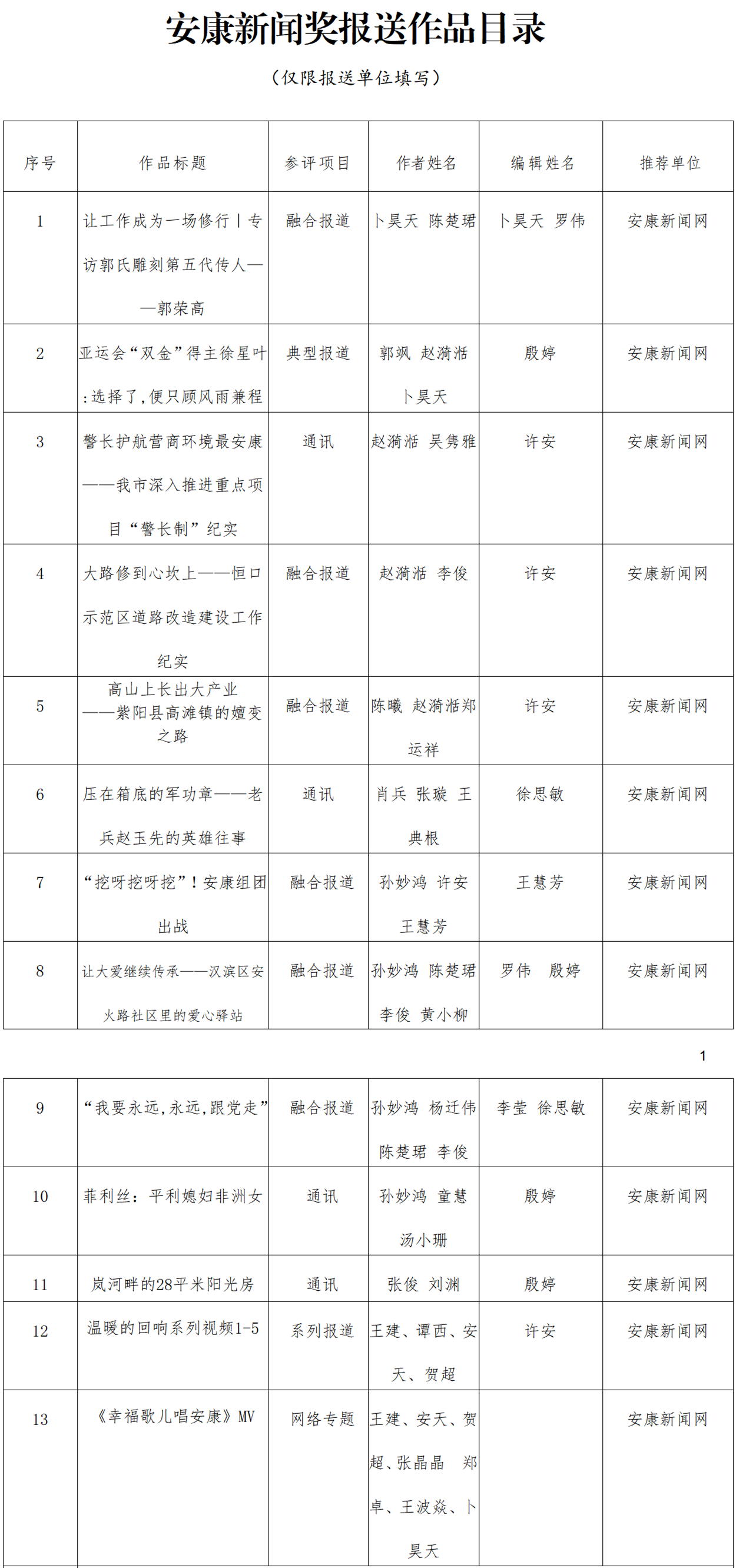 經過編委會推薦、社黨委研究決定,擬推薦以下13件新聞作品參評2023年度“安康新聞獎”。公示時間從2024年3月25日至2024年3月29日,公示期為5個工作日。如有不同意見,請向安康日報社機關紀委、新聞管理部反映。