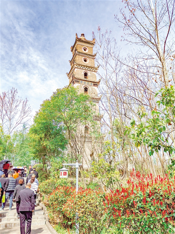 這時,塔側(cè)傳來歡快的鑼鼓聲,循聲望去,是一段十幾米的孝義文化長廊,一組男女或站或坐敲打著響器,使奠安塔不再寂寞。廊道的另一頭連接著奠安公園,環(huán)形觀景步道上擠滿了游覽的人。春分時節(jié),杏花正在萌發(fā),桃花含苞待放,倒是紅葉李花開正艷,細小如甲的花瓣布滿枝頭,零落軟泥上,雪白一片,仿佛成了李花的世界。舉目四望,花草清新,小學(xué)生在撿拾垃圾,胸前的紅領(lǐng)巾在陽光的照射下熠熠生輝,與周遭綠植映襯,絢爛了滿園春色。