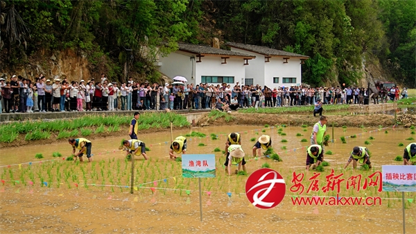 10點(diǎn)50分,插秧比賽正式開始,只見寨溝村、龍泉村、漁灣村、湯坪村四支隊(duì)伍在水田中依次排開。 隨著清脆的哨響,四支插秧隊(duì)伍迅速進(jìn)入狀態(tài),水田瞬間化作激烈的賽場(chǎng)。彎腰俯身,左手攥緊秧苗,右手分秧、插秧,一株株嫩綠的秧苗被精準(zhǔn)插入田中,泥水飛濺間,選手們你追我趕,汗水與歡笑交織,將傳統(tǒng)農(nóng)事活動(dòng)演繹成了一場(chǎng)精彩絕倫的視覺盛宴。