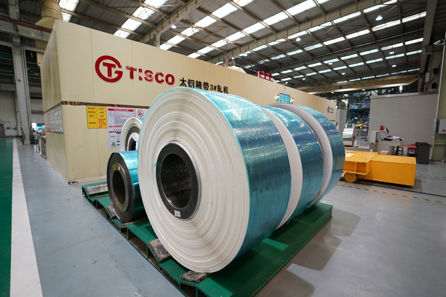 這是2023年10月24日拍攝的中國(guó)寶武山西太鋼不銹鋼精密帶鋼有限公司車間一角。一卷卷超薄“手撕鋼”產(chǎn)品擺放在車間內(nèi)。新華社記者 詹彥 攝