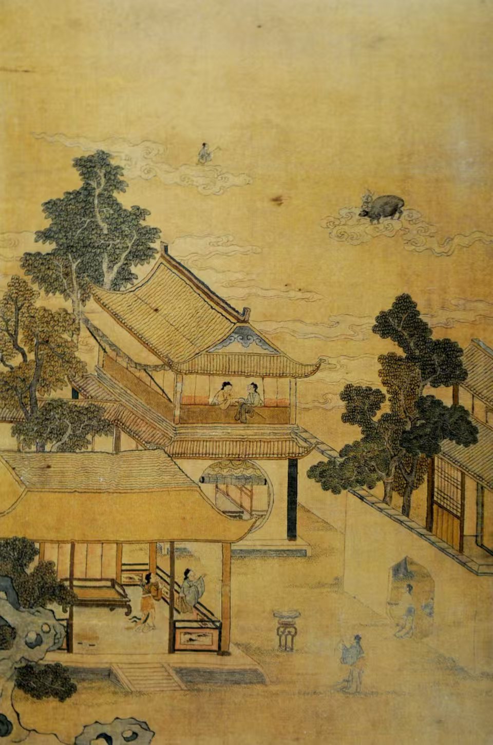 北京故宮博物院收藏的清代緙絲七夕乞巧圖軸,將天上和人間完美融合:上半部分是天上,牛郎織女在祥云圍繞下相會,眼神中充滿了深情和眷戀;下半部分是人間,幾位婦女或憑欄遠(yuǎn)眺,或?qū)掌蚯桑慌珊椭C景象。這幅圖軸以緙絲工藝展現(xiàn),色彩豐富、線條細(xì)膩,不僅展現(xiàn)了古人高超的技藝,也反映了當(dāng)時社會對七夕節(jié)的重視和人民對美好生活的向往。