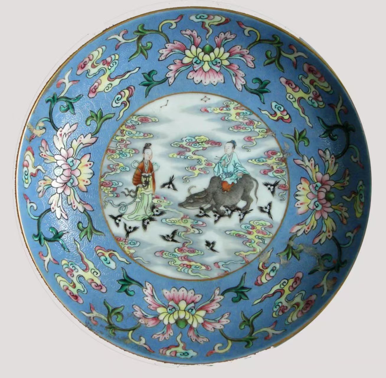 北京藝術(shù)博物館收藏的清代景德鎮(zhèn)官窯粉彩人物圖盤,就像一幅流動的七夕畫卷。此盤工藝精湛,口沿涂金,熠熠生輝,盡顯皇家氣派。盤內(nèi)外壁采用“粉彩軋道”工藝,天藍(lán)釉地上淺淺的卷草紋似微風(fēng)輕拂,粉彩花卉與朵云紋相互映襯,如夢如幻。盤內(nèi)底描金圓形開光處,粉彩繪就的人物故事圖案更為生動:牛郎坐于牛背,手握韁繩,深情凝望;織女身姿婀娜,嬌羞回望,二人似在互訴衷腸。背景中祥云繚繞、星辰閃爍、鵲鳥紛飛,為這場相會營造了浪漫的氛圍。外底“鵲橋仙渡”四字,點明主題。