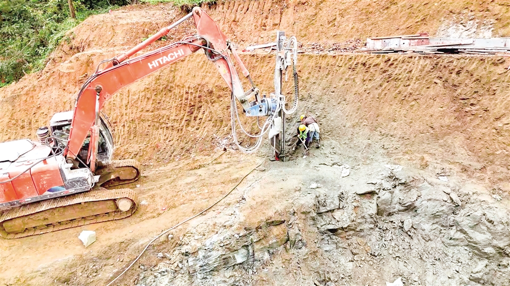 在鳳凰山隧道引線工程(進口段)項目建設(shè)現(xiàn)場,機器轟鳴,挖掘機揮舞著鏟斗挖掘土石,運輸車輛往來穿梭,配合默契。工人們鉚足干勁,爭分奪秒搶抓工期,現(xiàn)場一派熱火朝天的施工景象。