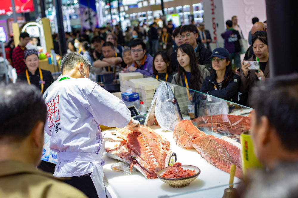 2025年11月7日,在第八屆進博會農(nóng)食產(chǎn)品展區(qū),參觀者在一處展臺觀看開魚秀。工作人員當場分切一條超過100公斤的金槍魚。英國奶酪、法國葡萄酒、意大利黑醋、馬來西亞榴蓮、厄瓜多爾巧克力、新西蘭乳制品、阿根廷牛肉……在本屆進博會農(nóng)食產(chǎn)品展區(qū),多款“洋特產(chǎn)”亮相,展商現(xiàn)場加工、制作食品,供參觀者品嘗。