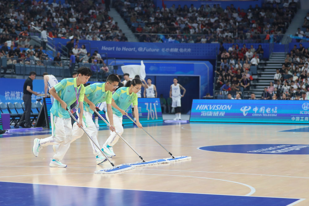 ??2023年9月28日,杭州亞運(yùn)會志愿者“小青荷”在杭州亞運(yùn)會籃球男子預(yù)賽B組比賽前清潔場地。從2016年二十國集團(tuán)領(lǐng)導(dǎo)人杭州峰會以來,“小青荷”這一志愿服務(wù)工作品牌已成為杭州大型賽會服務(wù)的一張金名片。
