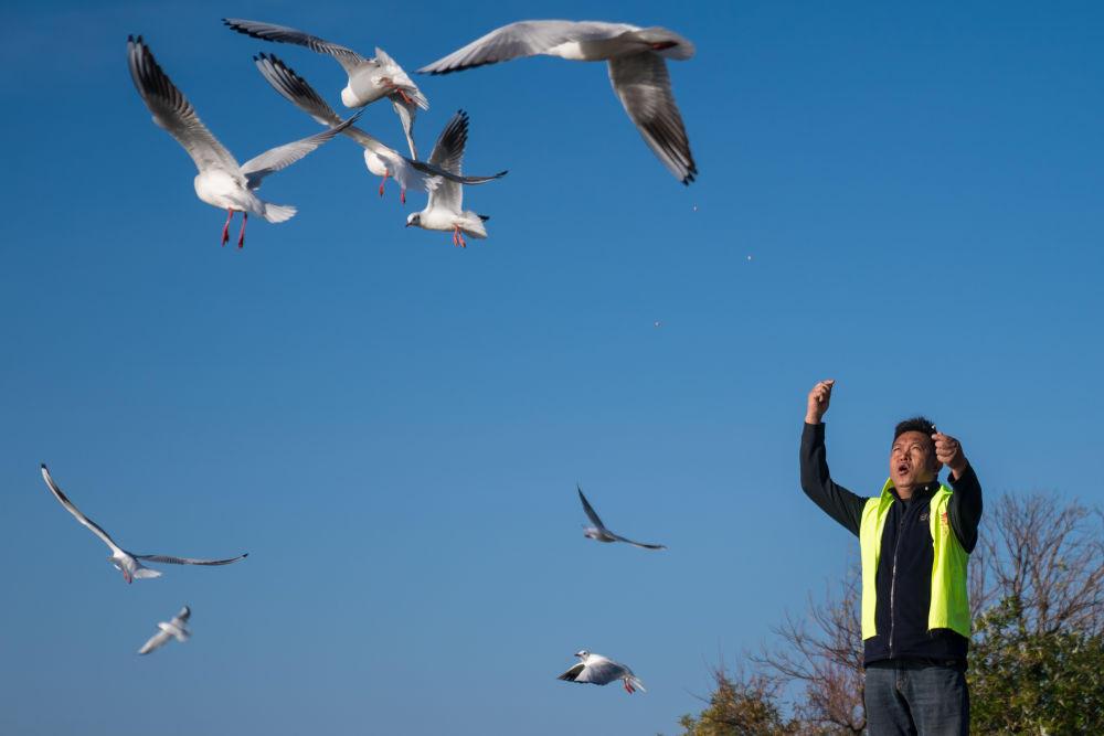 ??2024年12月11日,志愿者張利云在云南昆明王官濕地公園投喂紅嘴鷗。志愿者張利云堅持投喂紅嘴鷗長達(dá)十余年,為生態(tài)環(huán)境保護(hù)貢獻(xiàn)個人力量。