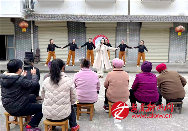 首場活動在城關(guān)鎮(zhèn)湯坪社區(qū)拉開帷幕。上午9點,演出團隊的小巴剛開進社區(qū)院子,志愿者們就迅速布置起臨時舞臺。隨著音樂聲響起,原本安靜的院子漸漸熱鬧起來,居民們?nèi)齼蓛蓢鷶n過來。暖陽下,志愿者早就擺好整齊的凳子,等候老人們?nèi)胱?/p>