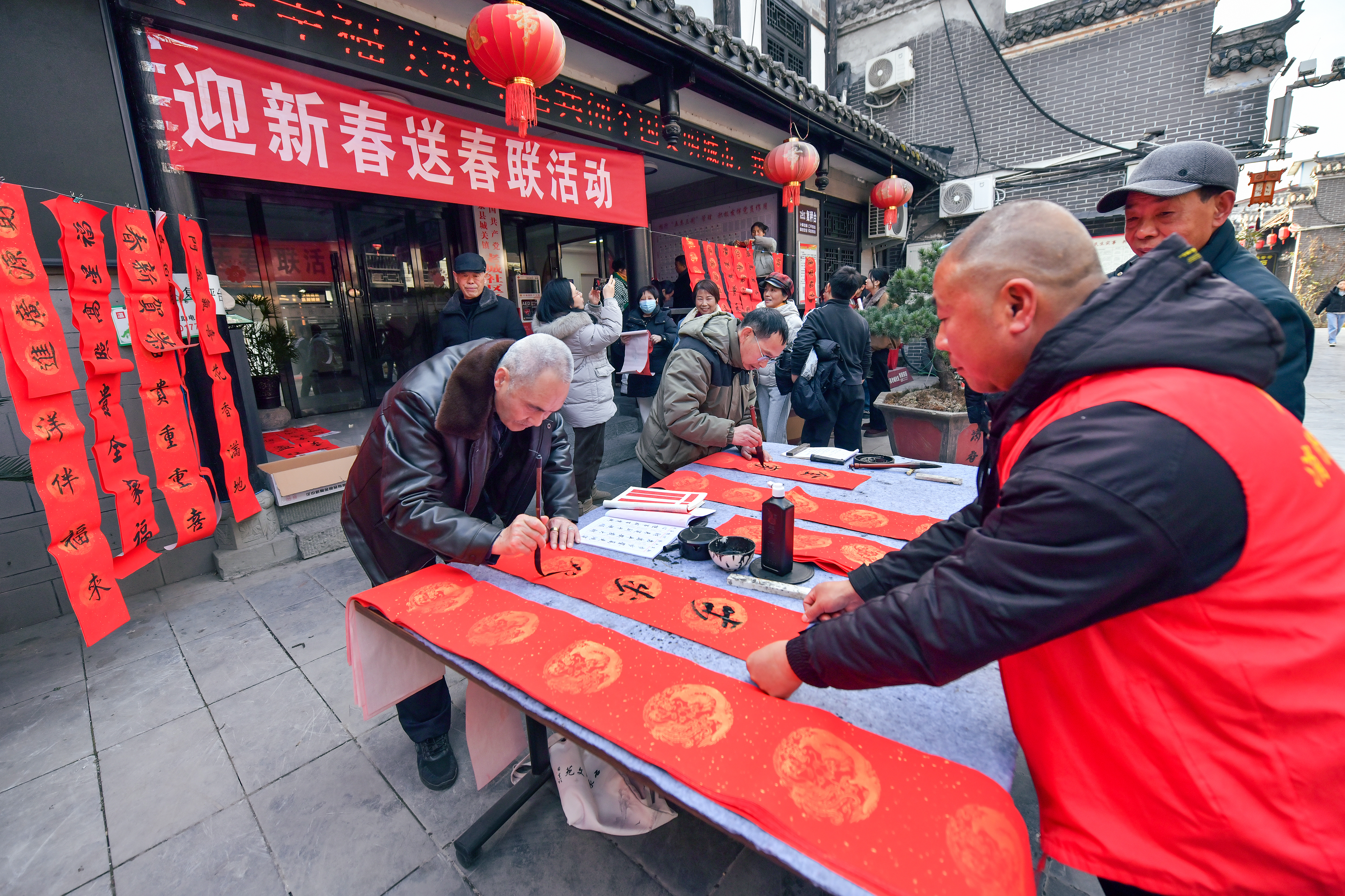 2月2日,石泉縣城關鎮(zhèn)老城社區(qū)新時代文明實踐站組織開展義寫春聯(lián)活動。書法愛好者現(xiàn)場揮毫,為居民送上新春祝福?;顒庸菜统龃郝?lián)200余副。董長松 攝