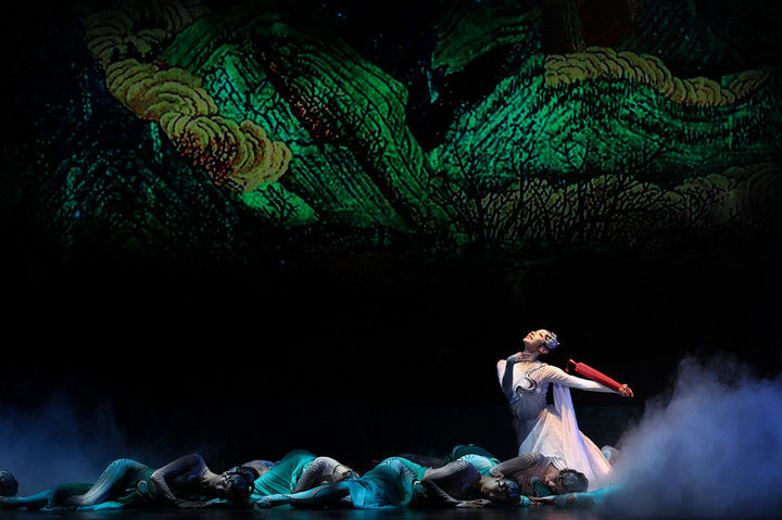 這是舞蹈詩劇《只此青綠》的演出劇照(2024年7月18日攝)?!吨淮饲嗑G》采用平行空間的敘事方式,從故宮博物院青年研究員的“展卷人”視角出發(fā),講述北宋著名畫家王希孟創(chuàng)作《千里江山圖》的故事。該劇連續(xù)3年穩(wěn)居中國舞劇票房榜首,全國巡演超800場,赴多個國家和地區(qū)演出50余場,成為傳統(tǒng)文化創(chuàng)新表達、中國藝術(shù)國際表達的典范之作。