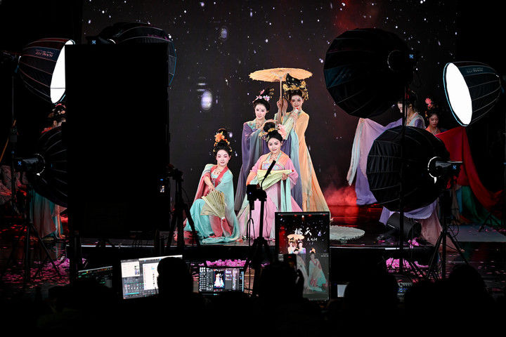 陜西省歌舞劇院的舞蹈演員在直播間進行“團播”表演(2025年12月25日攝)。“團播”這一多人演藝直播新形式,正成為專業(yè)文藝院團開辟線上“第二舞臺”、推動傳統(tǒng)文化創(chuàng)新表達的新嘗試。“豎屏化”“快節(jié)奏”的改編,讓傳統(tǒng)劇目受到越來越多年輕人喜愛。數(shù)據(jù)顯示,陜西省歌舞劇院“團播”單場最高曝光量超500萬,帶動線下票房增長約10%。