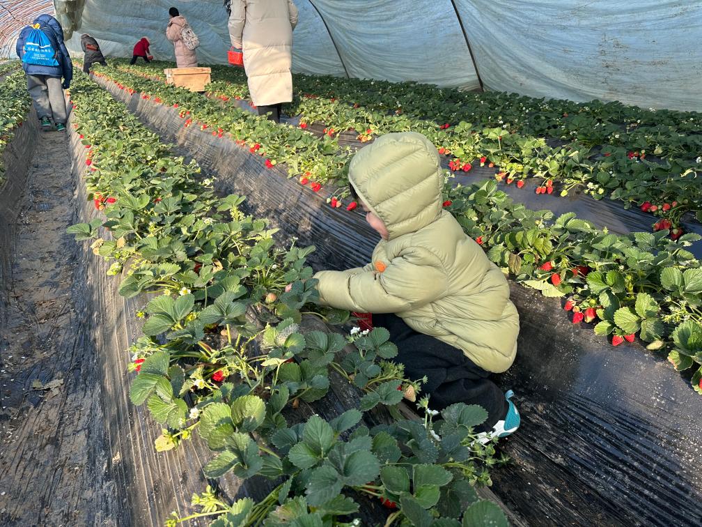 2026年1月22日,在河南洛陽孟津區(qū)送莊鎮(zhèn)十里香現代農業(yè)觀光園,前來研學的孩子們體驗采摘草莓的樂趣。(受訪者供圖)