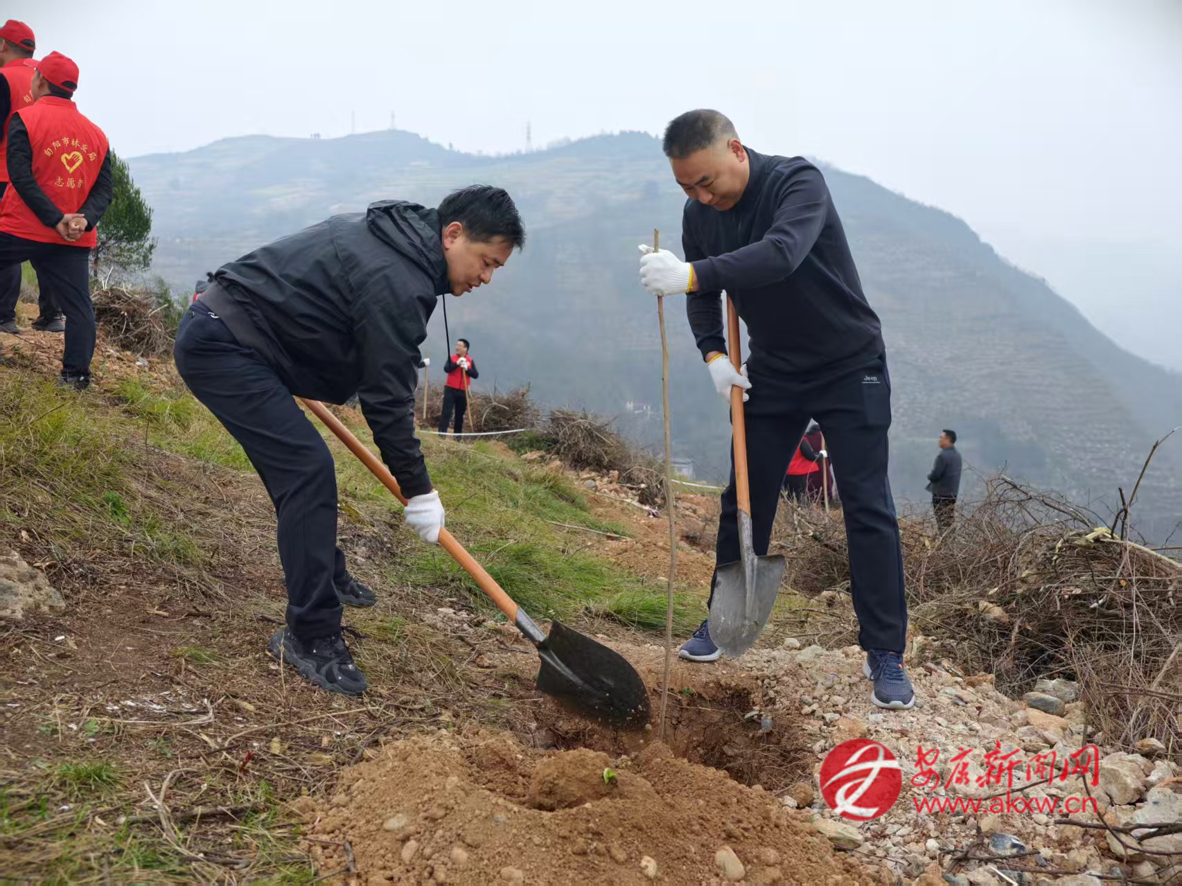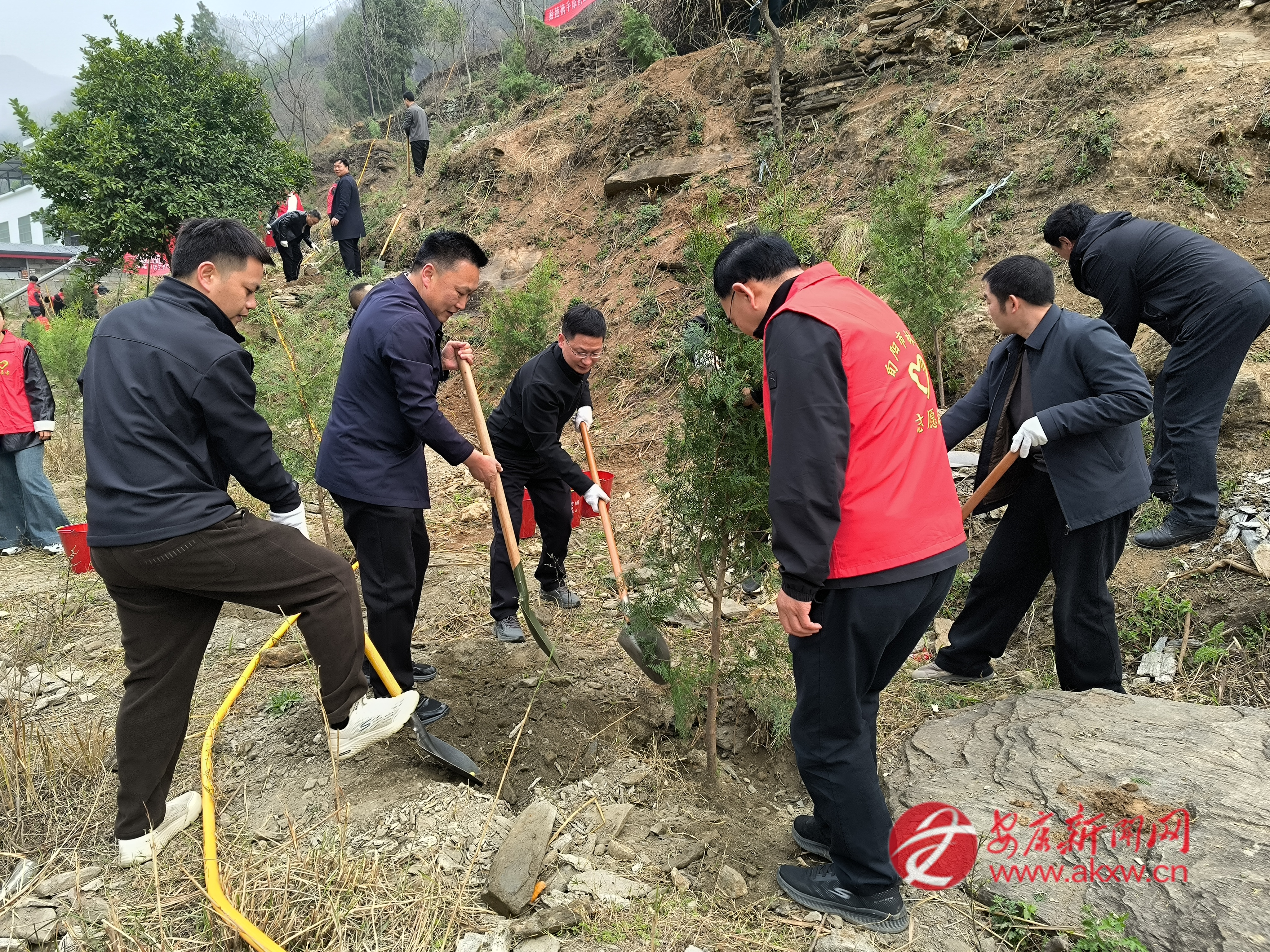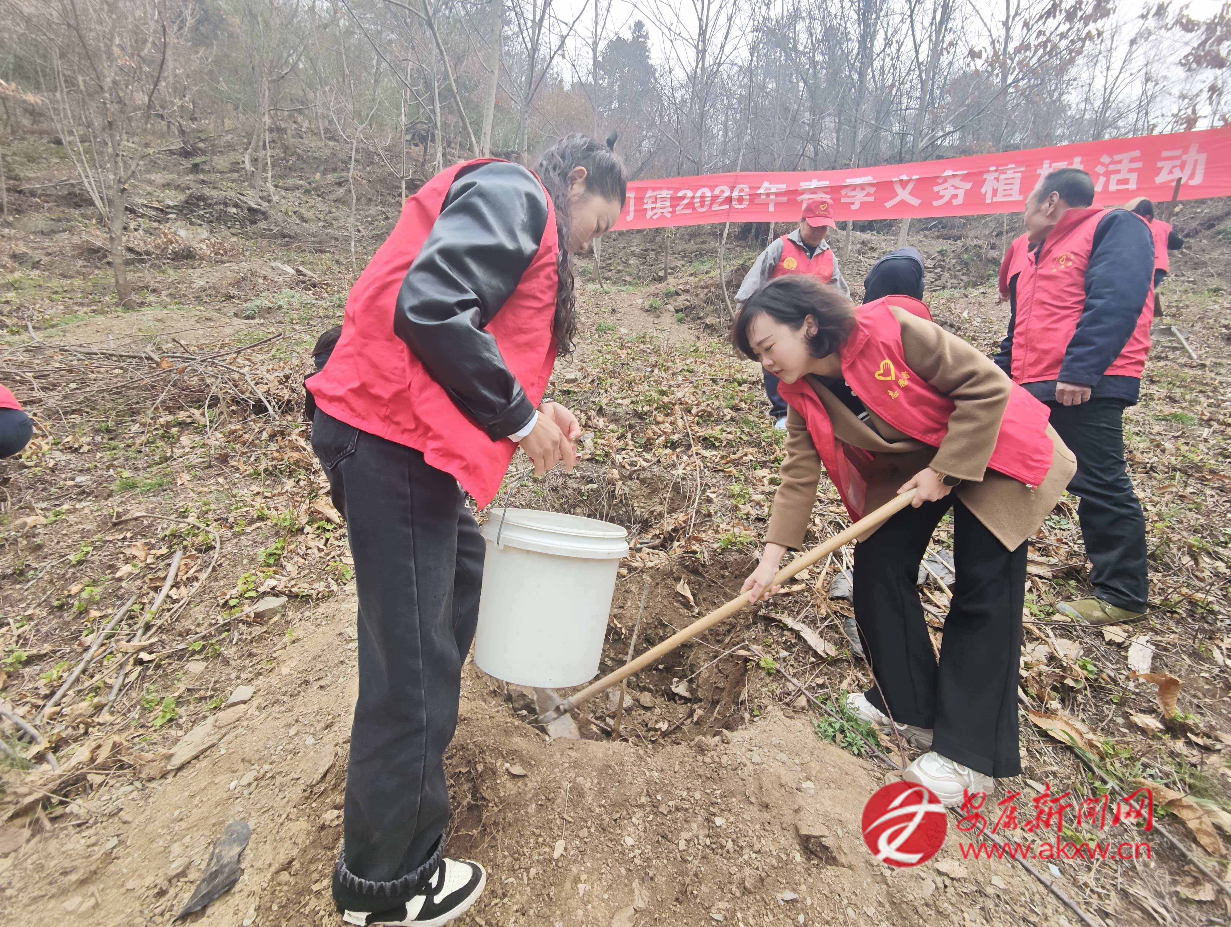 紅軍鎮(zhèn)組織機(jī)關(guān)干部、豐積社區(qū)黨員干部及群眾代表在李家院子開展義務(wù)植樹活動
