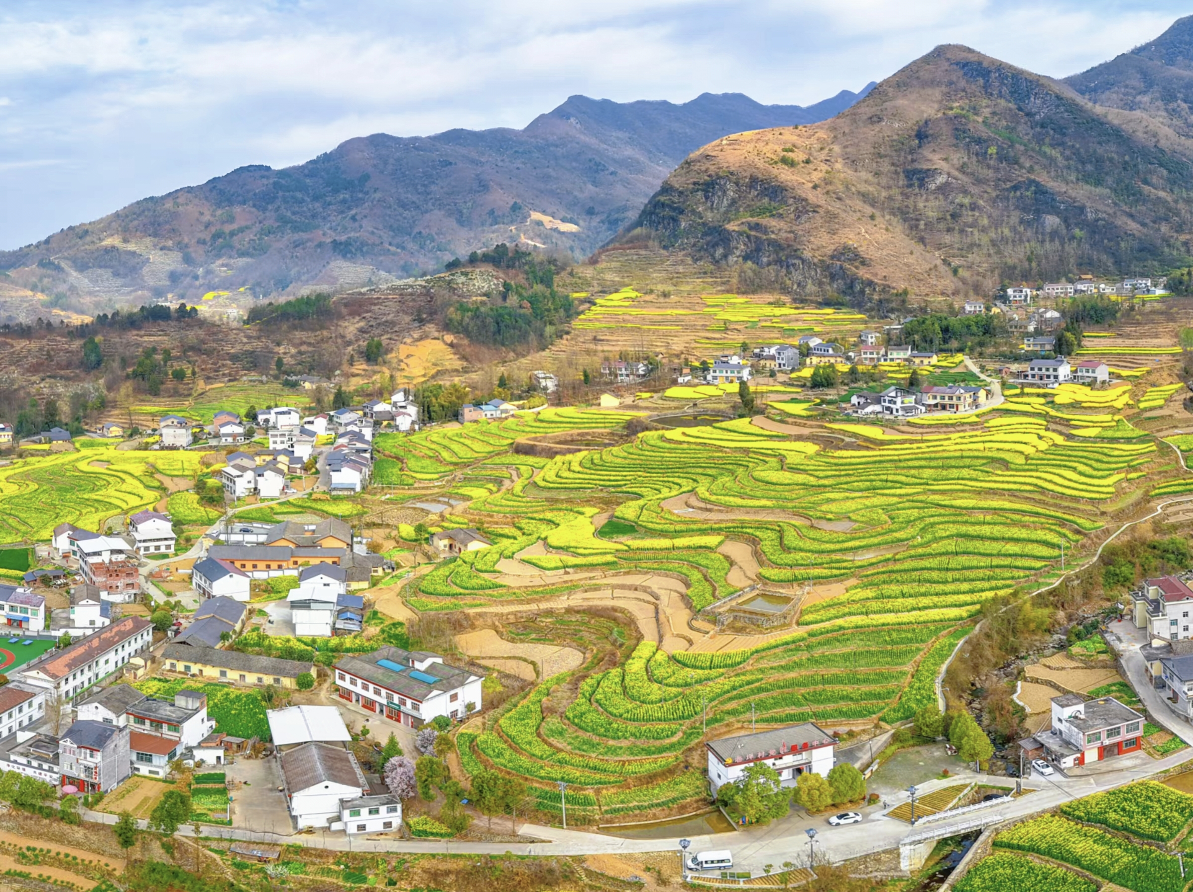 春風(fēng)拂過(guò)秦巴山區(qū),漢陰縣城關(guān)鎮(zhèn)的櫻花如霞似錦、李花如雪紛飛,鋪開(kāi)一片浪漫的花海,澗池鎮(zhèn)和蒲溪鎮(zhèn)的桃花將山坡染成緋紅色。向南而去,漩渦鎮(zhèn)的鳳堰梯田上,金色的油菜花順著山勢(shì)層層疊疊,如潮水般涌向天際。