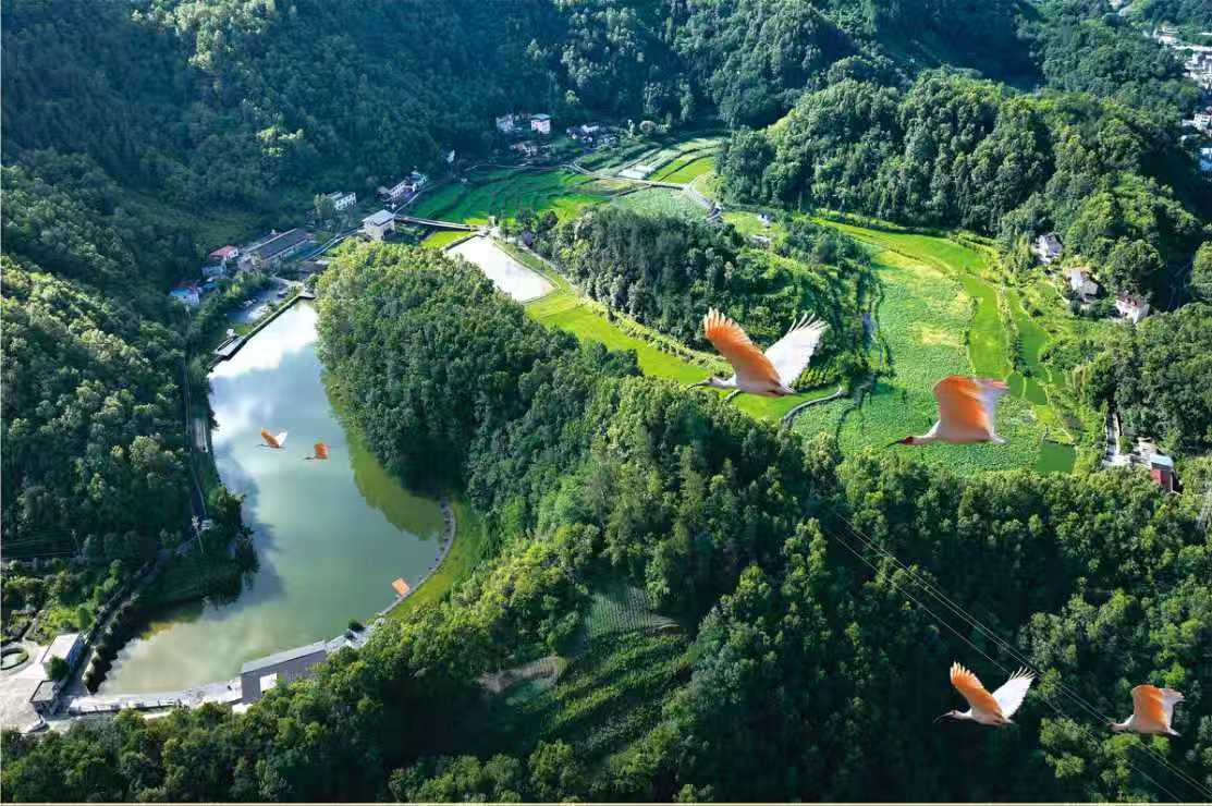 田野間,國家一級(jí)保護(hù)動(dòng)物朱鹮悠然棲息——或低頭覓食,或振翅掠過水面,與村莊、稻田構(gòu)成一幅和諧共生的畫面。