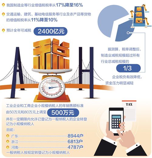 從5月1日起,我國(guó)制造業(yè)等行業(yè)增值稅稅率從17%降至16%,交通運(yùn)輸、建筑、基礎(chǔ)電信服務(wù)等行業(yè)及農(nóng)產(chǎn)品等貨物的增值稅稅率從11%降至10%,預(yù)計(jì)全年可減稅2400億元。