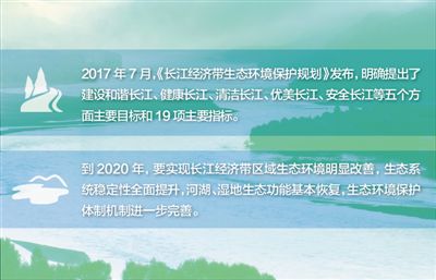 長江大保護,規(guī)劃先行。2016年,《長江經(jīng)濟帶發(fā)展規(guī)劃綱要》印發(fā)。去年7月,《長江經(jīng)濟帶生態(tài)環(huán)境保護規(guī)劃》發(fā)布,提出了建設和諧長江、健康長江、清潔長江、優(yōu)美長江、安全長江等五個方面主要目標和19項主要指標——到2020年,要實現(xiàn)長江經(jīng)濟帶區(qū)域生態(tài)環(huán)境明顯改善,生態(tài)系統(tǒng)穩(wěn)定性全面提升,河湖、濕地生態(tài)功能基本恢復,生態(tài)環(huán)境保護體制機制進一步完善;地表水質量國控斷面(點位)達到或優(yōu)于Ⅲ類水質比例達到75%以上,劣Ⅴ類比例小于2.5%,地級及以上城市集中式飲用水水源水質達到或優(yōu)于Ⅲ類比例達到97%以上。