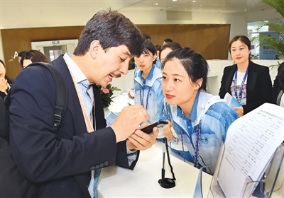本次峰會志愿者服裝設(shè)計采用靈動的海浪線條為主元素,因此,志愿者們被親切地稱為“小浪花”,構(gòu)成了黃海之濱一道亮眼風(fēng)景線。圖為6月6日,一名來自塔吉克斯坦的記者在新聞中心問詢臺向志愿者咨詢。 |