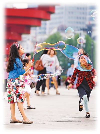 來自印度的小朋友雷特·梅赫塔(左)在青島五四廣場和中國小伙伴一起做游戲。 |
