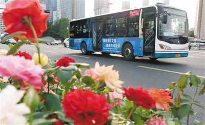 帶有上合峰會標(biāo)識的公交車行駛在青島街頭。 |