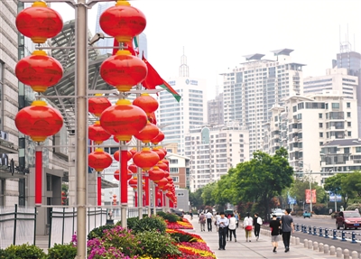 懸掛喜慶燈籠的青島市南區(qū)東海路。 |