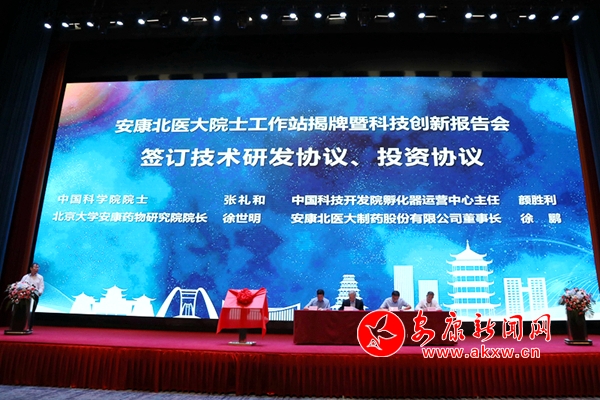 會上還簽訂了院士技術研發(fā)合作協議和投資合作協議。在隨后的科技創(chuàng)新報告會上,北京大學藥學院教授劉俊義、北京大學安康藥物研究院教授徐世明和中國科技開發(fā)院孵化器運營中心主任顏勝利分別作了學術報告。市直有關部門負責同志、安康北醫(yī)大合作企業(yè)代表以及安康學院師生代表等300余人現場聆聽學習。