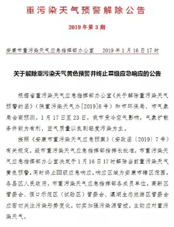 按照《安康市重污染天氣應(yīng)急預(yù)案》(安政函〔2019〕7號)有關(guān)規(guī)定,經(jīng)市重污染天氣應(yīng)急指揮部指揮長批準(zhǔn),市重污染天氣應(yīng)急指揮部辦公室決定于1月16日17時(shí)解除當(dāng)前重污染天氣黃色預(yù)警,同時(shí)終止Ⅲ級應(yīng)急響應(yīng),響應(yīng)區(qū)域?yàn)榘部凳休爡^(qū)范圍。各縣區(qū)人民政府,市重污染天氣應(yīng)急指揮部各成員單位,高新區(qū)管委會(huì)、恒口示范區(qū)(試驗(yàn)區(qū))管委會(huì)、瀛湖生態(tài)旅游區(qū)管委會(huì)應(yīng)密切關(guān)注污染形勢變化,切實(shí)加強(qiáng)污染源管控,主動(dòng)應(yīng)對重污染天氣。