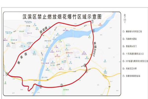 漢濱區(qū)禁止燃放煙花爆竹的區(qū)域:西起襄渝線與月河交匯處向南至馬坡嶺水源站,南起馬坡嶺水源站、香溪洞頭天門至十天高速安康東出入口,東起207省道與黃洋河大橋交匯處向北至安康東鐵路貨運站,北起安康東鐵路貨運站經(jīng)陽安線、襄渝線與月河交匯處。