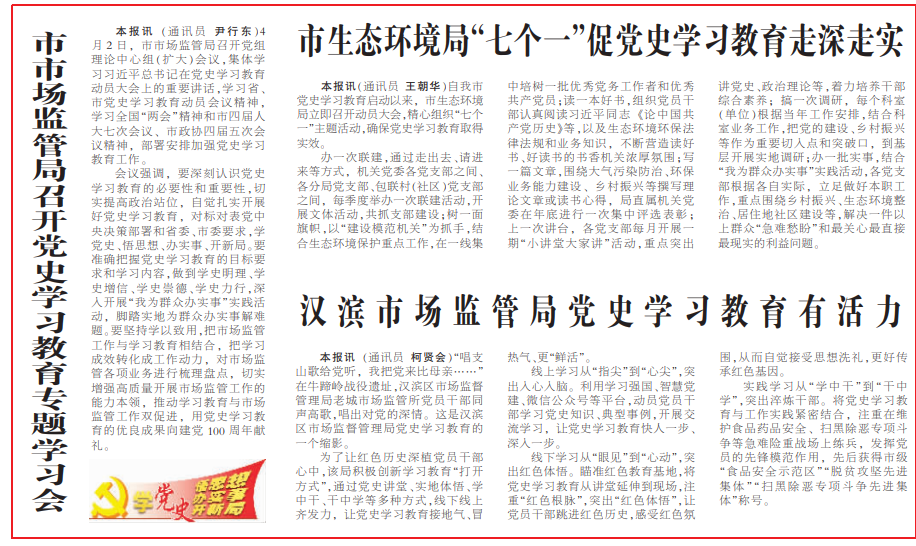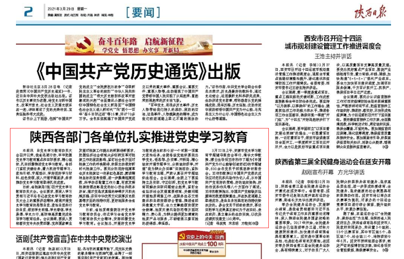 《安康日報》在及時轉載新華社關于中央開展黨史學習教育有關活動的同時,主動跟進報道我市黨史學習教育系列安排部署!栋部等請蟆芳皶r開設“學黨史 悟思想 辦實事 開新局”專欄,刊發(fā)全市黨史學習教育動態(tài)。截至目前,《安康日報》和安康新聞網開設“黨史上的今天”、“慶祝中國共產黨成立100周年”、“學黨史、悟思想、辦實事、開新局”、“奮斗百年路 啟航新征程”等報紙和網站及微信公眾號、視頻號專欄6個,刊發(fā)全市黨史學習教育動態(tài)報道和理論文章300余篇,其中《習近平總書記黨史學習教育動員大會上的重要講話在我市引起熱烈反響》《黨員干部心中植下“三棵樹” 》《在學黨史中增強“三力”》等一批稿件產生積極影響。