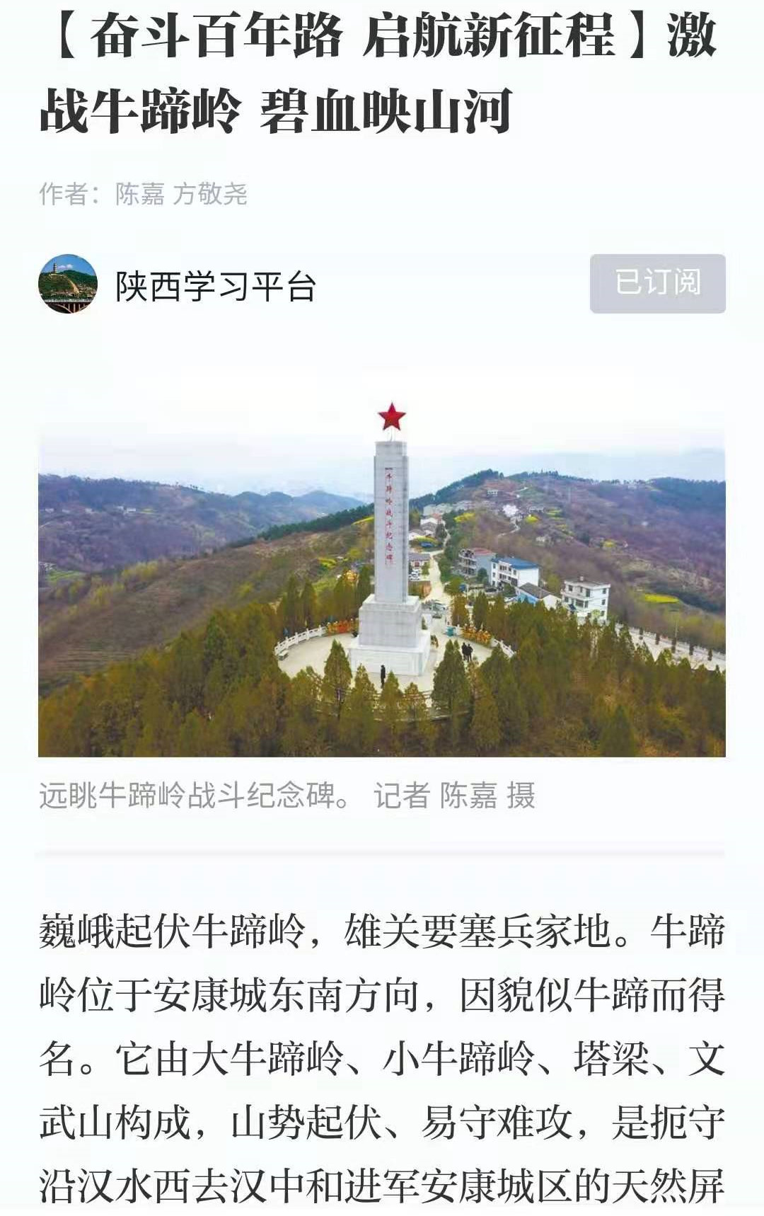 3月29日以來,《陜西日報》以《全省各部門各單位扎實推進黨史學習教育》為題,對我市舉行首場黨史學習教育專題報告會進行了報道。緊接著,“學習強國”推出了《陜西安康市漢濱區(qū):忠魂千秋耀山鄉(xiāng) 慷慨奮進著新篇》《激戰(zhàn)牛蹄嶺 碧血映山河》兩篇報道。陜西廣播電視臺、群眾新聞網、西部網集中播出我市策劃拍攝的《繼承廖乾五的革命精神 凝聚起百年奮進新征程強大力量》的主題報道。《市委常委班子在牛蹄嶺開展黨史學習教育》視頻新聞被新華網、陜西法制網轉載。