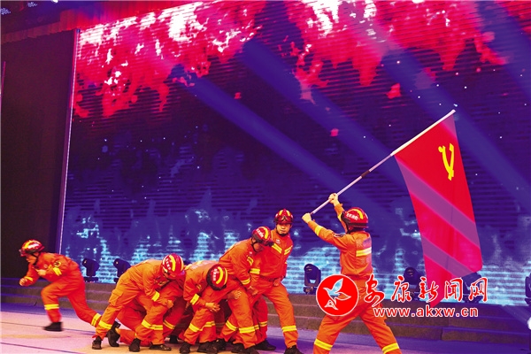 (6月26日,“永遠跟黨走·逐夢火焰藍”安康市消防救援支隊慶祝建黨100周年文藝匯演在石泉大劇院精彩上演,參加演出的消防員用嘹亮的歌聲、熱情的舞蹈真摯的表達感謝黨、感恩黨、祝福黨。劉紀麟 攝)