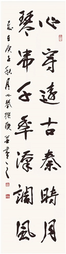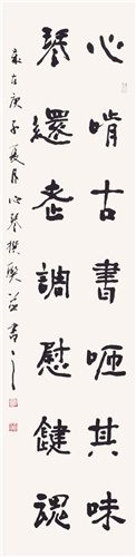 其中以書法進(jìn)益尤快, 在趙心琴看來,畫家必須勤習(xí)書法,她認(rèn)為好的書法必須出于情理之中、法度之外,性情中人的她書法也是性情之作,常常隨著性情表達(dá)自己的心境。她可以從行書中求變化,楷書中找活潑,在隸書中也不墨守成規(guī),重視臨摹但不拘泥于過去的范本,每一幅書法作品都是自己針對(duì)不同的主體作出的創(chuàng)作,每幅作品都求新求變。同時(shí)她認(rèn)為稱心的國(guó)畫作品必須把好題款這道關(guān),如此方才相映成輝。2012年,省圖書館舉辦陜西作家書畫展,趙心琴應(yīng)邀出席,觀展時(shí)觸景生情,三五天后,一副不忘家鄉(xiāng)養(yǎng)育恩“巴山承心志,漢水潤(rùn)琴音”的嵌名處女聯(lián)誕生了!此后,興致所致,偶有妙句成聯(lián)。再后來,一發(fā)不可收,僅以她的名字“心琴”二字,前后不重復(fù),內(nèi)容不重復(fù),陸陸續(xù)續(xù)累計(jì)撰寫了三百多副藏名聯(lián)。據(jù)趙心琴講:有時(shí)她為一字的斟酌耗費(fèi)幾天精力,甚至夜不成寐。