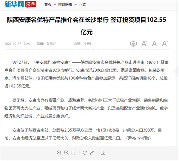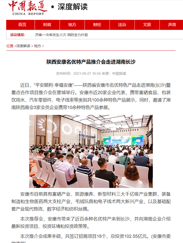 本網(wǎng)訊 9月27日,由中共安康市委、安康市人民政府,陜西省商務(wù)廳聯(lián)合主辦的“平安順利·幸福安康——陜西省安康市名優(yōu)特色產(chǎn)品走進(jìn)湖南(長沙)暨重點合作項目推介會”在長沙市成功舉辦。新華社、中國交通廣播、中國報道、湖南日報、長沙晚報、三湘都市報、國際在線、紅網(wǎng)等中省、長沙以及駐長多家媒體紛紛給予報道。媒體不僅高度贊揚兩地的合作成果,并對安康有了一個嶄新的評價和認(rèn)識。一起看看“老親戚”長沙眼中的“老鄰居”安康是什么樣!