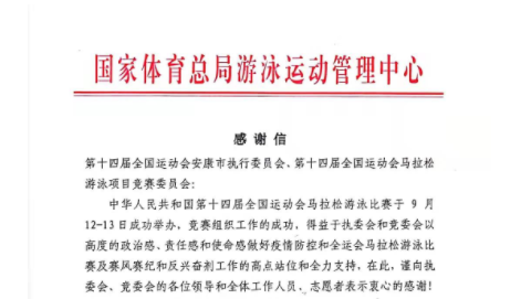 本網(wǎng)訊(記者 魏濤 陸青波)秋高氣爽收獲時(shí)節(jié)傳來(lái)令人振奮的消息,9月21日,國(guó)家體育總局游泳運(yùn)動(dòng)管理中心向我市發(fā)來(lái)感謝信,對(duì)我市成功舉辦十四運(yùn)會(huì)馬拉松游泳賽……