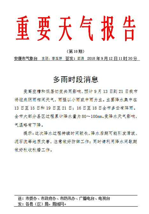 降水主要集中在13日至15日和19日至21日;16日至18日全市多云有降雨。全市大部分縣區(qū)累計(jì)降水80~100mm。受降水影響,氣溫略有下降。yKb安康新聞網(wǎng)