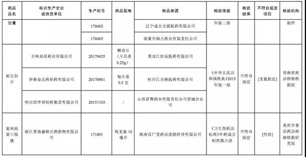 經(jīng)青海省藥品檢驗(yàn)檢測院檢驗(yàn),標(biāo)示為吉林雙星藥業(yè)有限公司、伊春金北藥制藥有限公司、哈爾濱華雨制藥集團(tuán)有限公司生產(chǎn)的3批次刺五加片不符合規(guī)定,不符合規(guī)定項(xiàng)目為含量測定。TWN安康新聞網(wǎng)