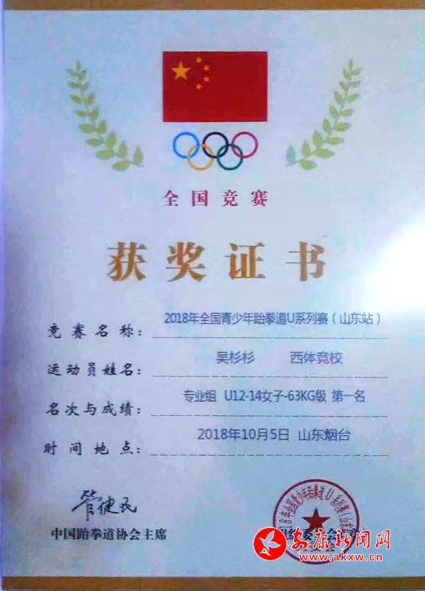 安康新聞網(wǎng)訊 10月6日,2018年全國青少年跆拳道U系列賽(山東站)在山東省煙臺市圓滿落幕。漢陰縣澗池初級中學(xué)學(xué)生吳杉杉代表陜西省出征大賽并榮得專業(yè)組U12-14女子63kg級比賽冠軍。BbP安康新聞網(wǎng)