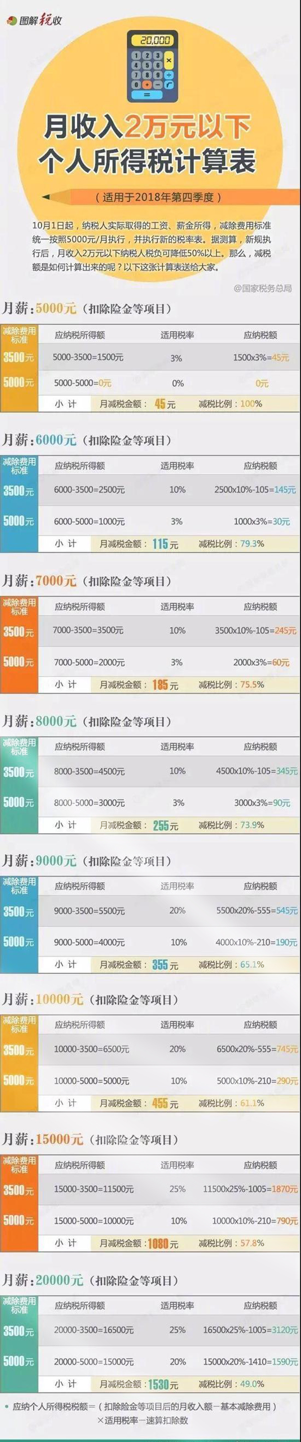 今年8月,新個稅法通過,“起征點”每月5000元,10月1日起實施。10月9日,國家稅務(wù)總局官方微信號對外公布“月收入2萬元以下個稅計算表”,月入2萬元以下能減多少稅?一查便知。KB3安康新聞網(wǎng)