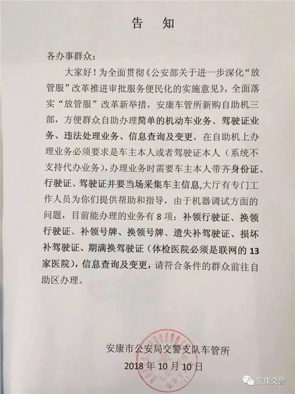 為全面貫徹落實(shí)公安部“放管服”改革新舉措,安康市公安局交警支隊(duì)車(chē)管所新購(gòu)自助機(jī)三部,方便群眾自助辦理簡(jiǎn)單的機(jī)動(dòng)車(chē)、駕駛證、違法處理、信息查詢(xún)及變更等業(yè)務(wù),車(chē)主和駕駛員本人(系統(tǒng)不支持代辦業(yè)務(wù))只需持身份證、行駛證、駕駛證,當(dāng)場(chǎng)采集車(chē)主信息、辦理業(yè)務(wù)。車(chē)管所大廳自助服務(wù)設(shè)備目前能自助辦理的業(yè)務(wù)有8項(xiàng)::補(bǔ)領(lǐng)行駛證、換領(lǐng)行駛證、補(bǔ)領(lǐng)號(hào)牌、換領(lǐng)號(hào)牌、遺失補(bǔ)駕駛證、損壞補(bǔ)駕駛證、期滿(mǎn)換駕駛證(體檢醫(yī)院必須是聯(lián)網(wǎng)的13家醫(yī)院),信息查詢(xún)及變更。
