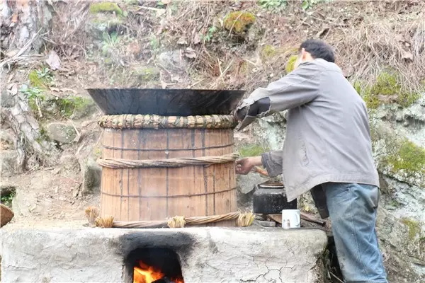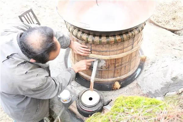 燒火的人要注意觀察火勢的大小,留心酒糟翻騰的泡泡,不時用手測測上面鐵鍋里水的溫度。上面鐵鍋里的水總在不斷升溫。大概到三十度的時候就要舀出來,重新注入涼水。否則就不能起冷凝作用,蒸騰上去的酒會跑掉。
