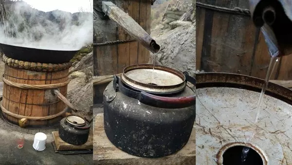 烤酒離不開天鍋和地鍋,天鍋是放在甑子(一種木頭做的類似于沒底的木桶,只不過是上面稍。┥系。地鍋是放在灶上,烤酒的時候地鍋里加水,上面蓋上用竹子做的蒸屜,蒸屜上用紗布覆蓋(防止糧食掉進水里),紗布上放上發(fā)酵好的碎甜高粱桿和粗糠以及碎米釀子,大概占甑子體積的70%。上面蓋上天鍋,里面的水保持在40度以下,利用酒精揮發(fā)和蒸汽遇冷水凝結(jié)下落的原理酒就順著一個導(dǎo)管接到外面。