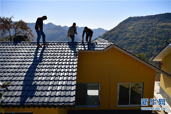 10月29日,工人在漢濱區(qū)茨溝鎮(zhèn)西溝村的輕鋼裝配式房屋頂上安裝屋脊瓦。 新華社記者邵瑞攝