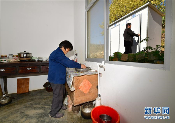10月29日,漢濱區(qū)茨溝鎮(zhèn)西溝村村民焦南玉(左)在重建的輕鋼裝配式房屋內整理蔬菜,屋外配有沖水式廁所。 新華社記者邵瑞攝