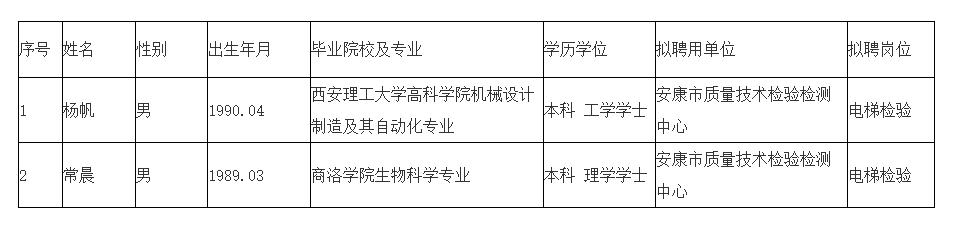安康市質(zhì)量技術(shù)監(jiān)督局2018年公開招聘緊缺特殊人才擬聘用人員公示