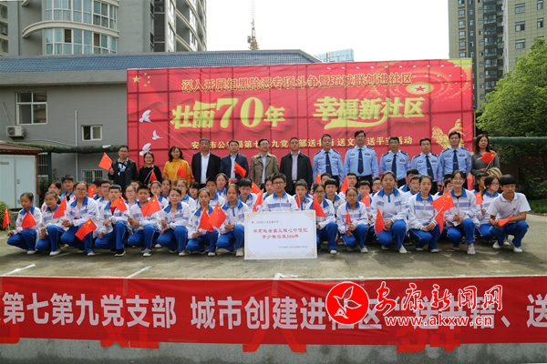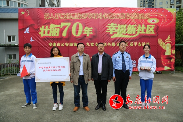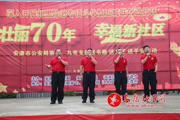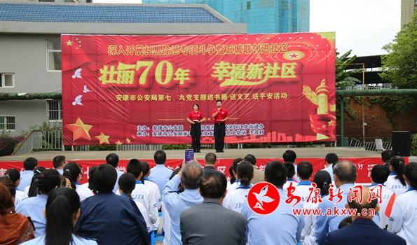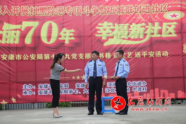 本網(wǎng)訊 (通訊員 周瑞儒)壯麗70年,幸福新社區(qū)。在新中國成立70周年即將來臨之際,9月21日上午,市公安局機(jī)關(guān)第七、第九黨支部深入漢濱區(qū)江北辦事處中渡社區(qū),開展掃黑除惡專項(xiàng)斗爭暨“五城聯(lián)創(chuàng)”進(jìn)社區(qū)“送書籍、送文藝、送平安”活動。市公安局、市創(chuàng)建辦、安康日報社、江北街道辦事處相關(guān)負(fù)責(zé)人,市公安局機(jī)關(guān)第七、第九黨支部全體民警輔警,市公安局創(chuàng)建辦、漢濱分局江北派出所負(fù)責(zé)人,江北高級中學(xué)學(xué)生代表、社區(qū)群眾200余人參加活動。
