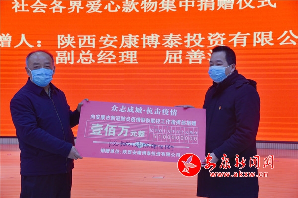 儀式現(xiàn)場,陜西安康博泰投資有限公司董事長、溫州人趙章漢,委托專人向安康市疫情防控指揮部捐贈人民幣100萬元,和價值8余萬元的消毒液1000桶、方便面100箱、礦泉水100箱、蔬菜1000公斤等物資,助力安康戰(zhàn)“疫”。nFq安康新聞網(wǎng)