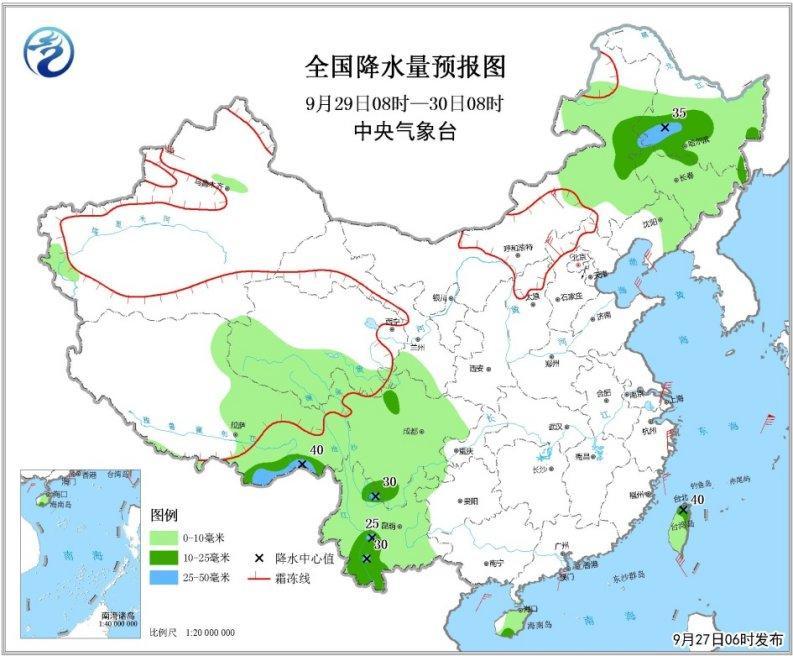 9月29日08時(shí)至30日08時(shí),內(nèi)蒙古東部、東北地區(qū)大部、西南地區(qū)大部、海南島、青藏高原中東部和臺(tái)灣島等地部分地區(qū)有小到中雨,其中,黑龍江西南部和西藏東南部等地的部分地區(qū)局地大雨(25~40毫米)。新疆北部、內(nèi)蒙古中部、華北北部、江南東部等地的部分地區(qū)有4~6級(jí)偏北風(fēng)(見圖3)。